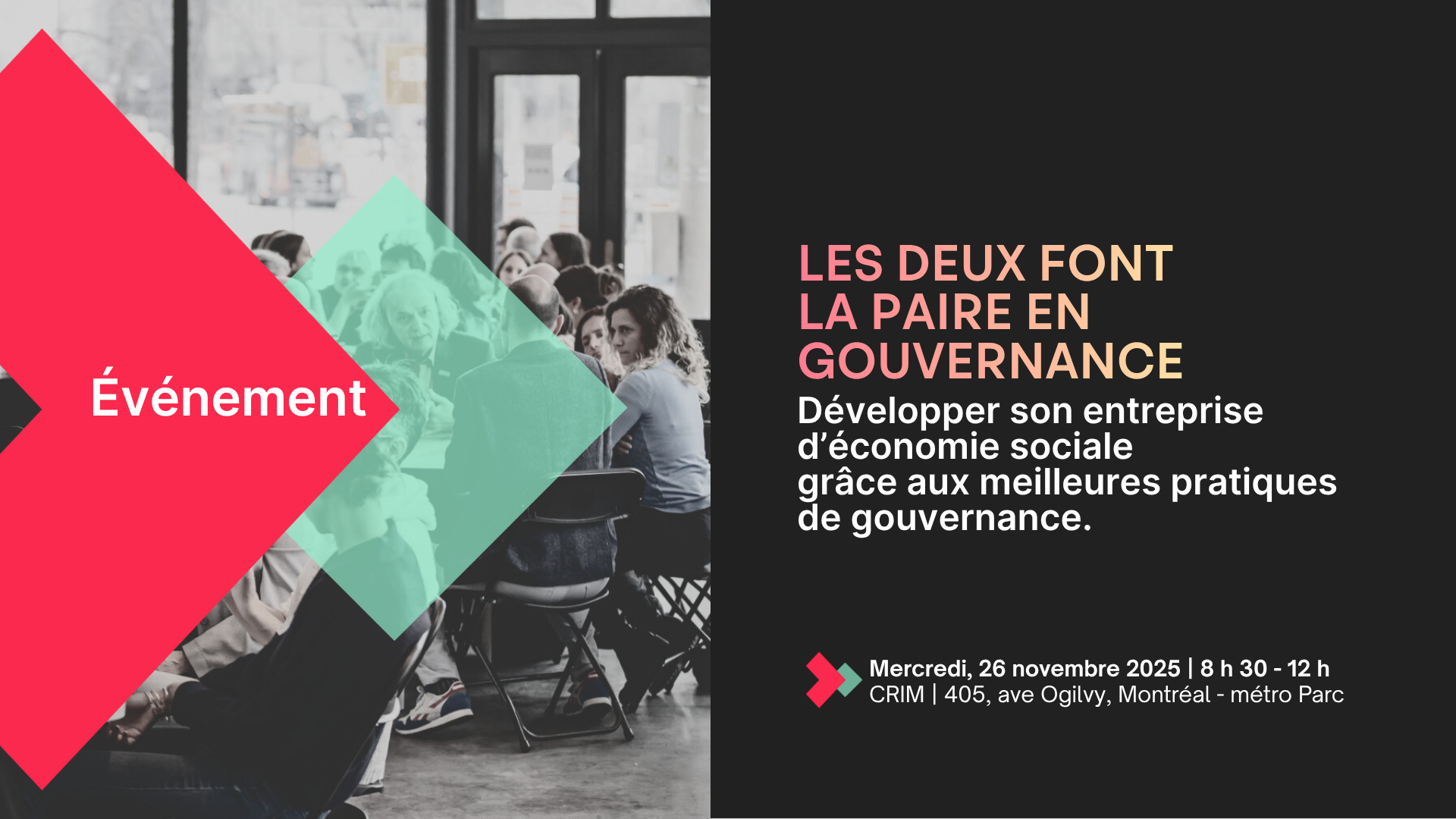Cet événement est pour vous si vous occupez un poste de direction ou un siège sur un CA (OBNL ou coopérative). C’est une bonne occasion de venir en paire avec un‑e membre de votre CA !